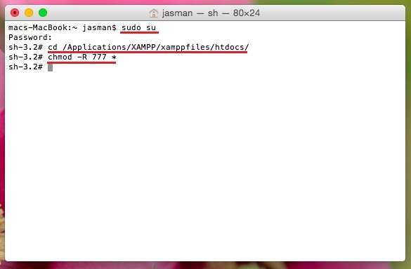 $ sudo su $ cd cd /Applications/XAMPP/xamppfiles/htdocs $ chmod -R 777 *