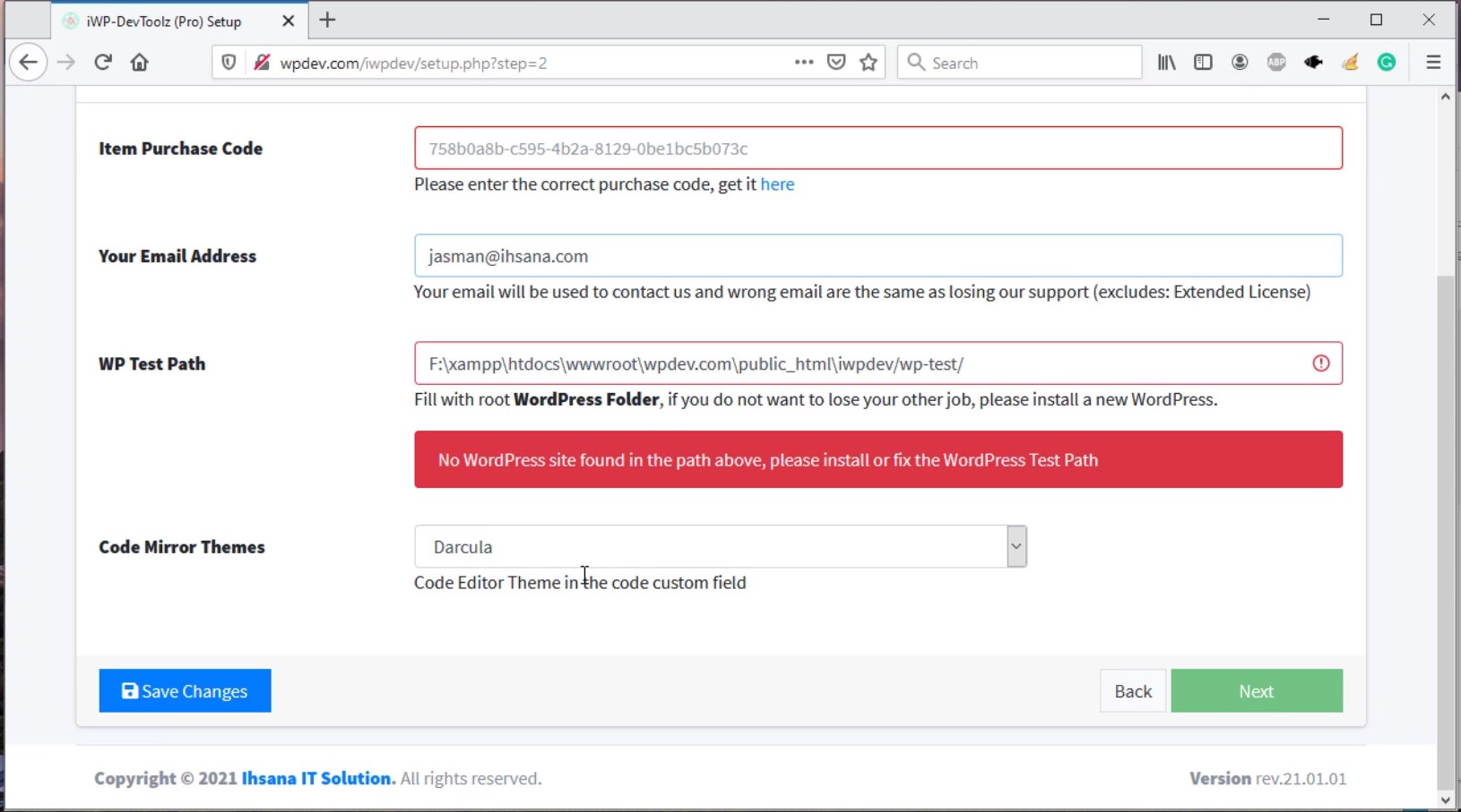 After successfully extracting and changing the file permissions, then you can configure it via the browser. Open http://localhost/iwpdev, for the first time you will be directed to the Setup configuration page and please enter the requested data.