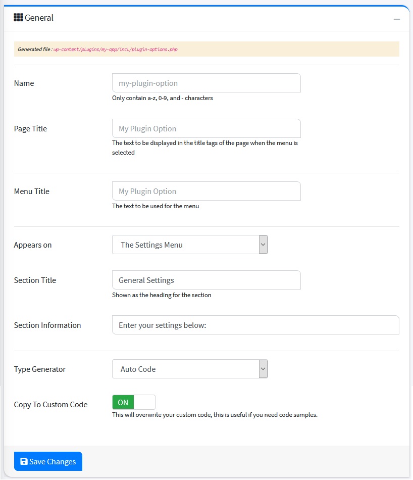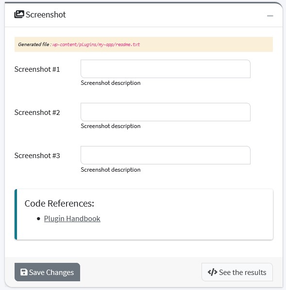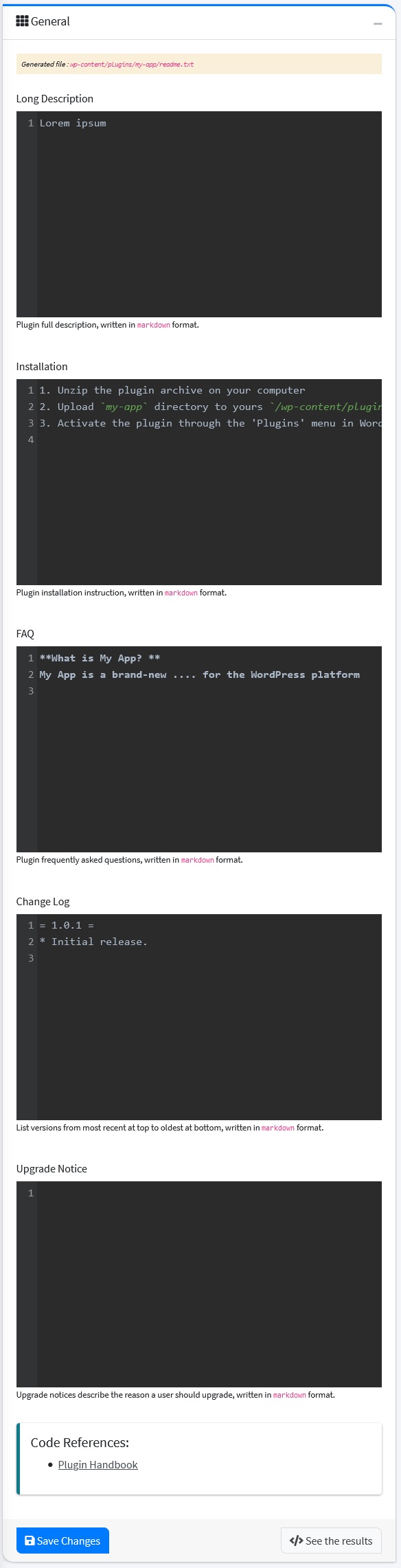 Next you have to create a README file, this file is useful if you publish your plugin to the official wordpress site. Click the ReadMe menu on the side menu, you will be asked to fill out the forms provided or let it use the default data.