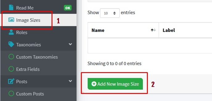 Goto Image Size page by clicking Image Sizes menu on side menu, after that click Add New Image Size button. Then complete the fields provided and Click Save Changes Button.