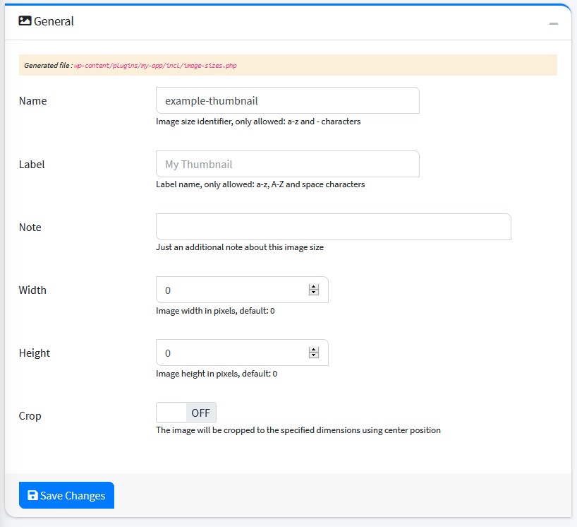 | Name | Image size identifier, only allowed: a-z and - characters | my-cover |