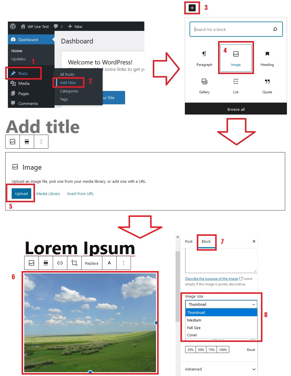 Login to WordPress Dashboard and try to create a new post. Write the content, by adding blocks and selecting images and uploading images. Once the image is uploaded, click the image and see the image properties on the right. the image size you created should appear in the image size option.