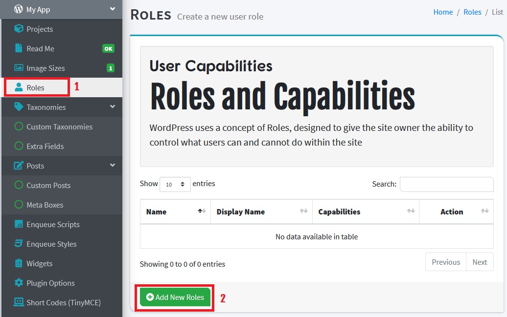 Roles is a role concept to give site owners the ability to control what users can and cannot do. Under the Image Sizes menu, there is the Roles menu, click Roles menu then click Add New Roles button, then the Roles page will appear, please complete the fields provided and Click Save Changes button
