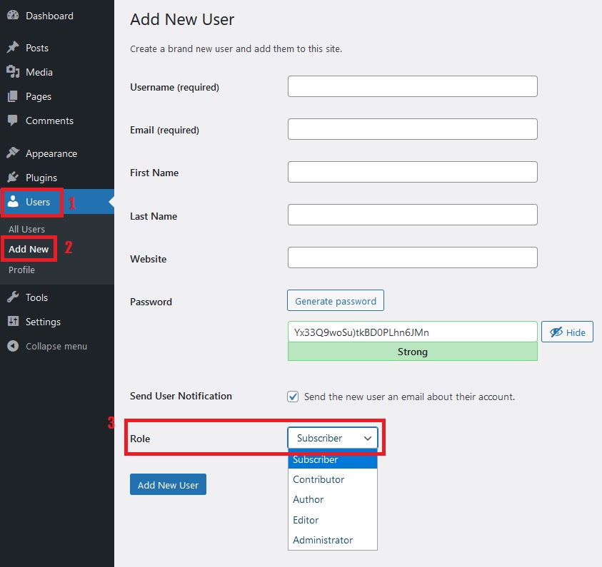 After that go to Users Menu then click Add New. The Add New User page appears, the roles you created should already be in the Role option.