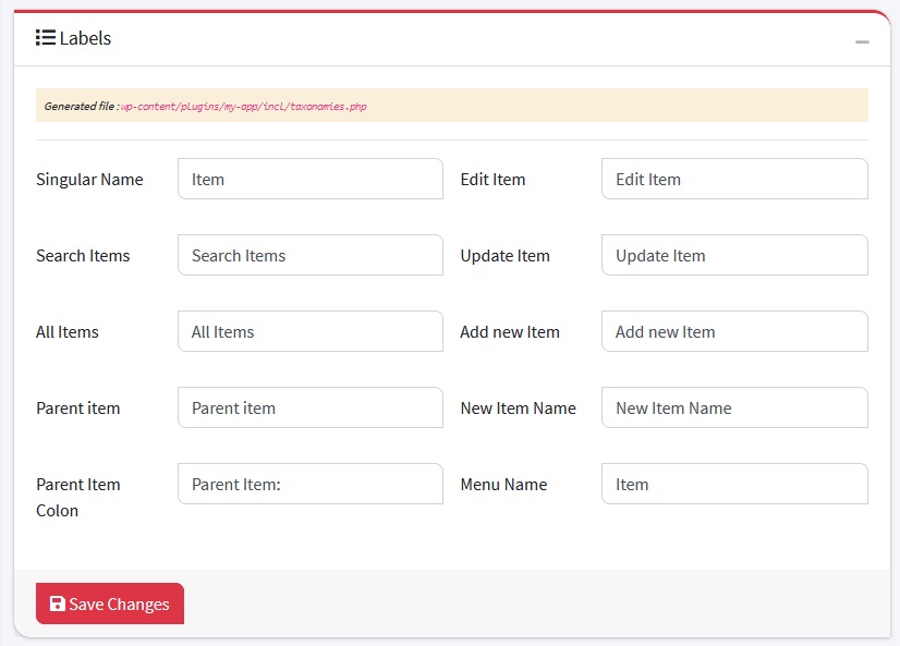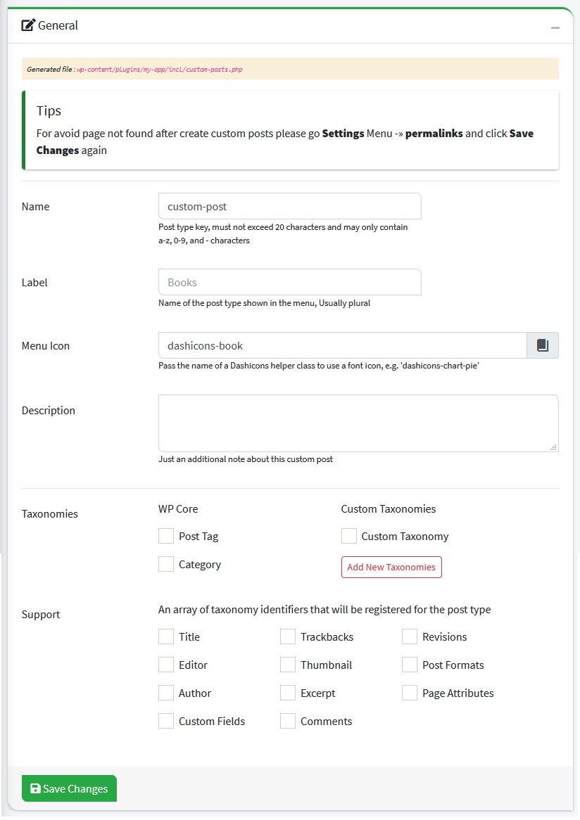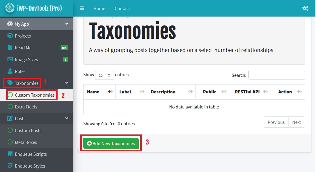 How to add taxonomies is very easy, click the Taxonomies menu on sidemenu, then click Custom Taxonomies. The Taxonomies page will appear, then click the Add New Taxonomies button. Complete the fields provided, then click the Save Changes button.