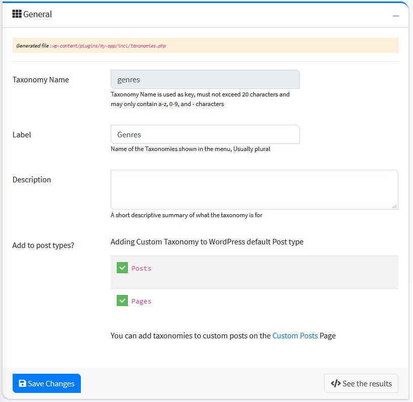 | Taxonomy Name | Taxonomy Name is used as key, must not exceed 20 characters and may only contain a-z, 0-9, and - characters | genre |