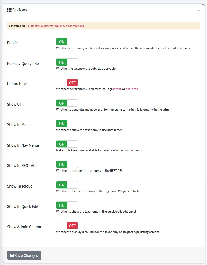 | Show In Menu | Whether to show the taxonomy in the admin menu | ON |