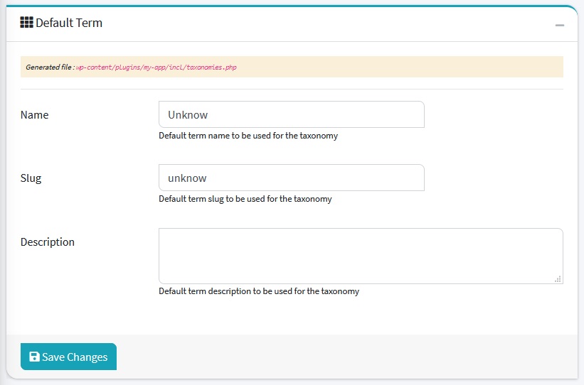 | Name | Default term name to be used for the taxonomy | Unknow |