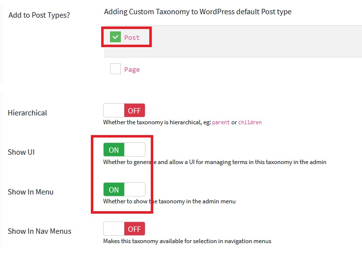| Show In Nav Menus | Makes this taxonomy available for selection in navigation menus | ON |