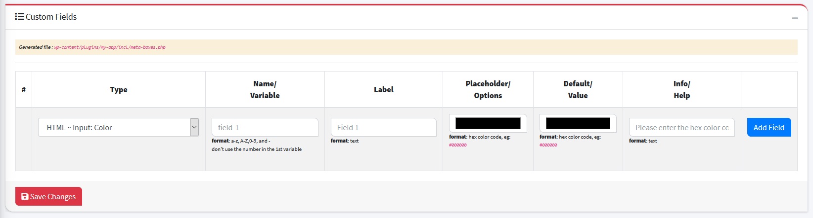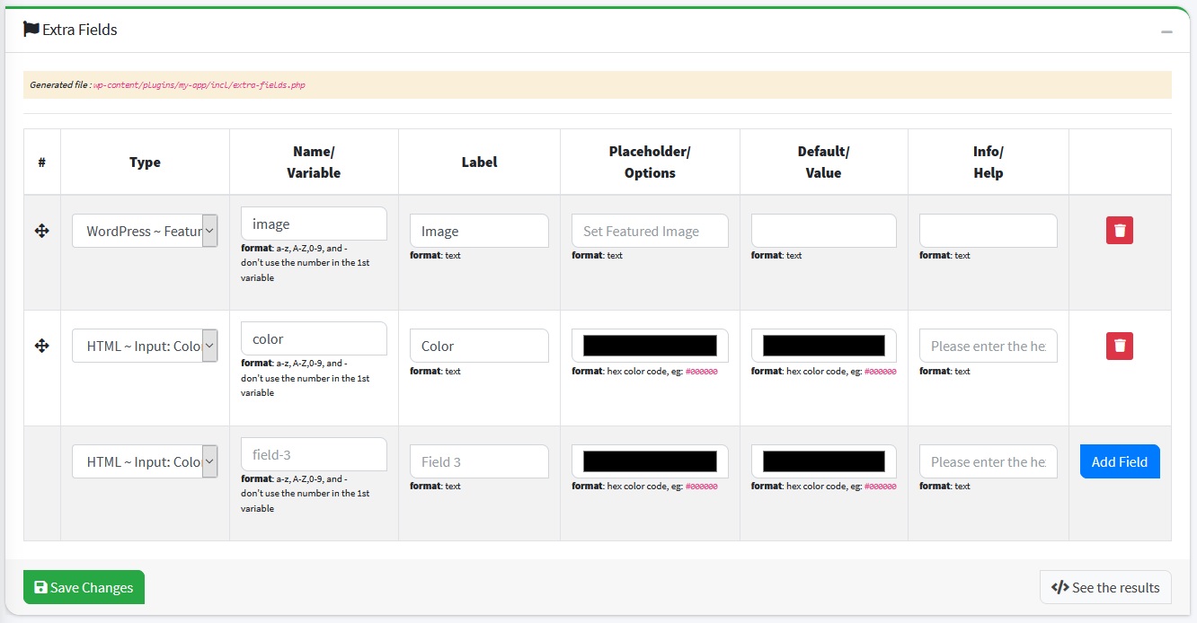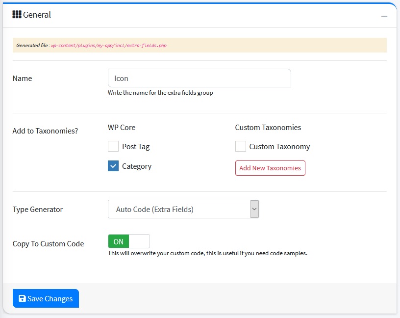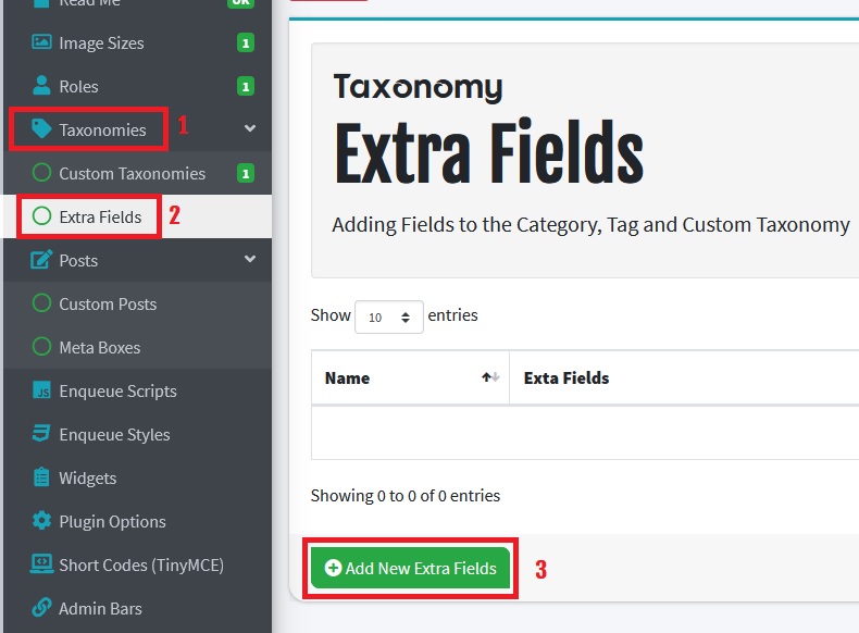 To create extra-fields code go to the Taxonomies menu then click Extra Fields, The extra-field page will appear then click Add New Extra-Fields button, and complete the requested data then click Save Changes button.
