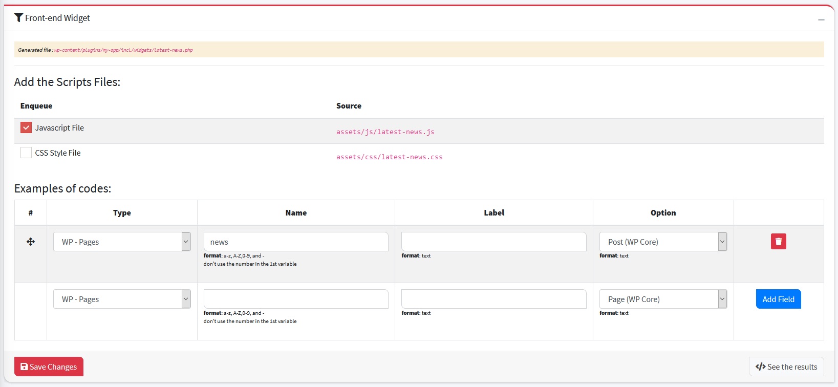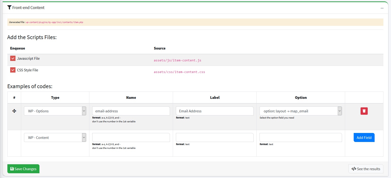 In this feature you can add scripts to your content layout, you just need to tick Javascript File or CSS Style File. And as well as the sample code needed to create your content layout, you just need to add what code samples you need. code will be generated to your content layout.