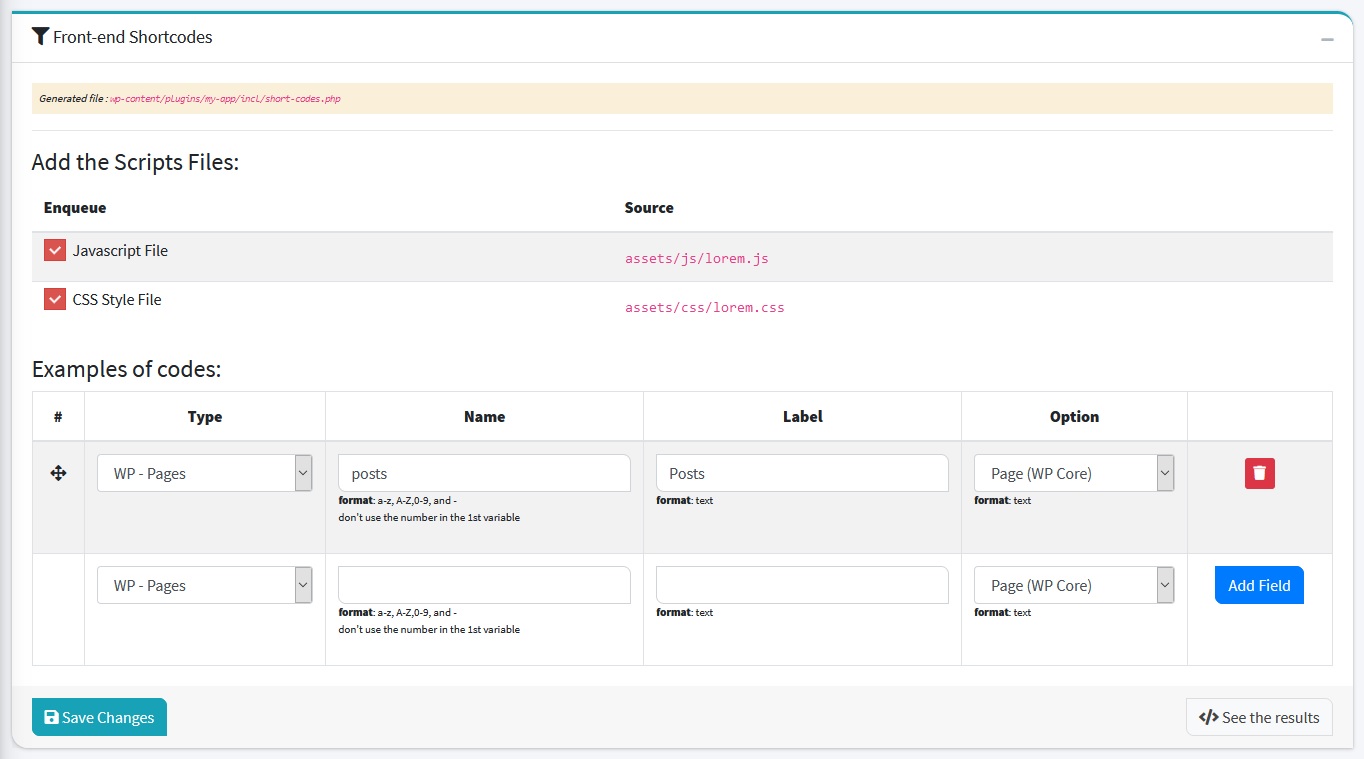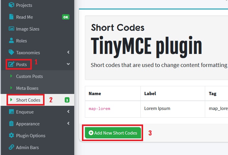 Go to the Posts menu then clicking the Short Codes, The Short Code page will appear, then click the Add New Short Code button. Complete the form provided then click Save Changes button.