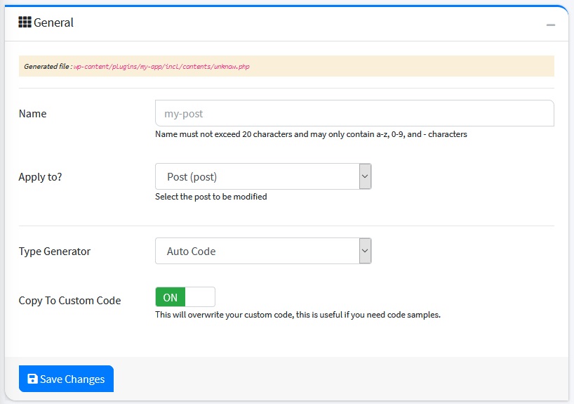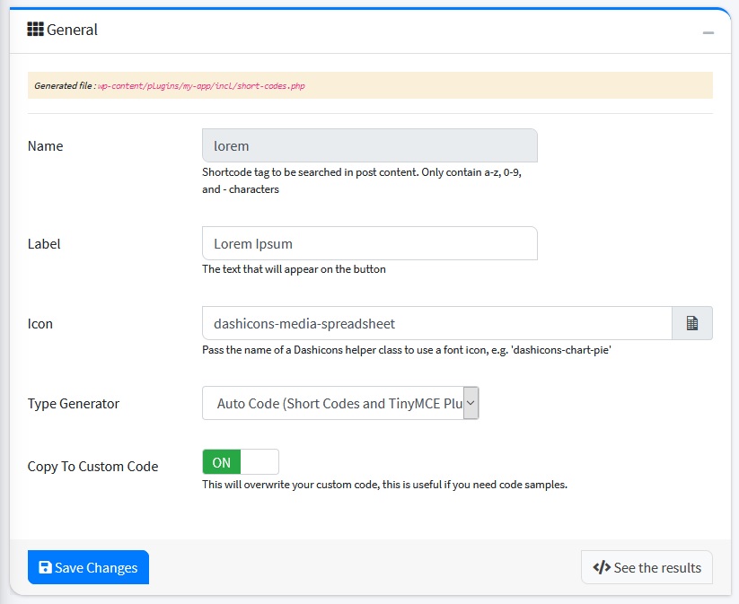 | Name | Shortcode tag to be searched in post content. Only contain a-z, 0-9, and - characters | lorem-ipsum |