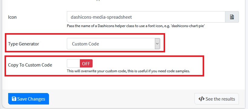 | Icon | Pass the name of a Dashicons helper class to use a font icon, e.g. 'dashicons-chart-pie' | dashicons-media-spreadsheet |