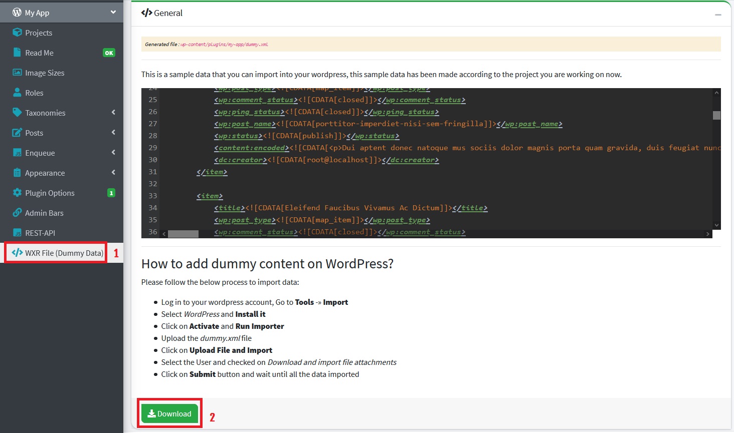 WXR File is a sample data that you can import into your wordpress, this sample data has been made according to the project you are working on now.
