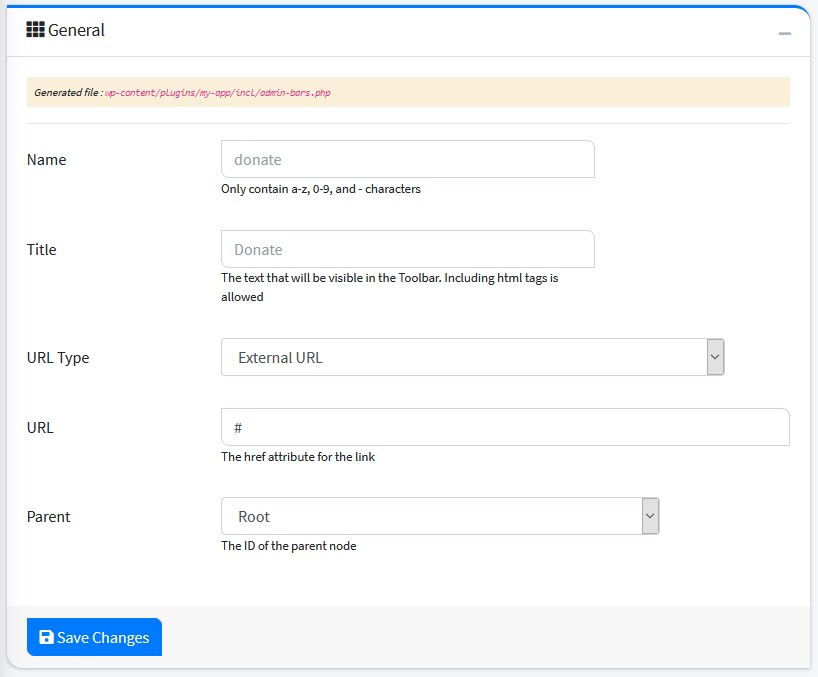 | Title | The text that will be visible in the Toolbar. Including html tags is allowed> | Donate |